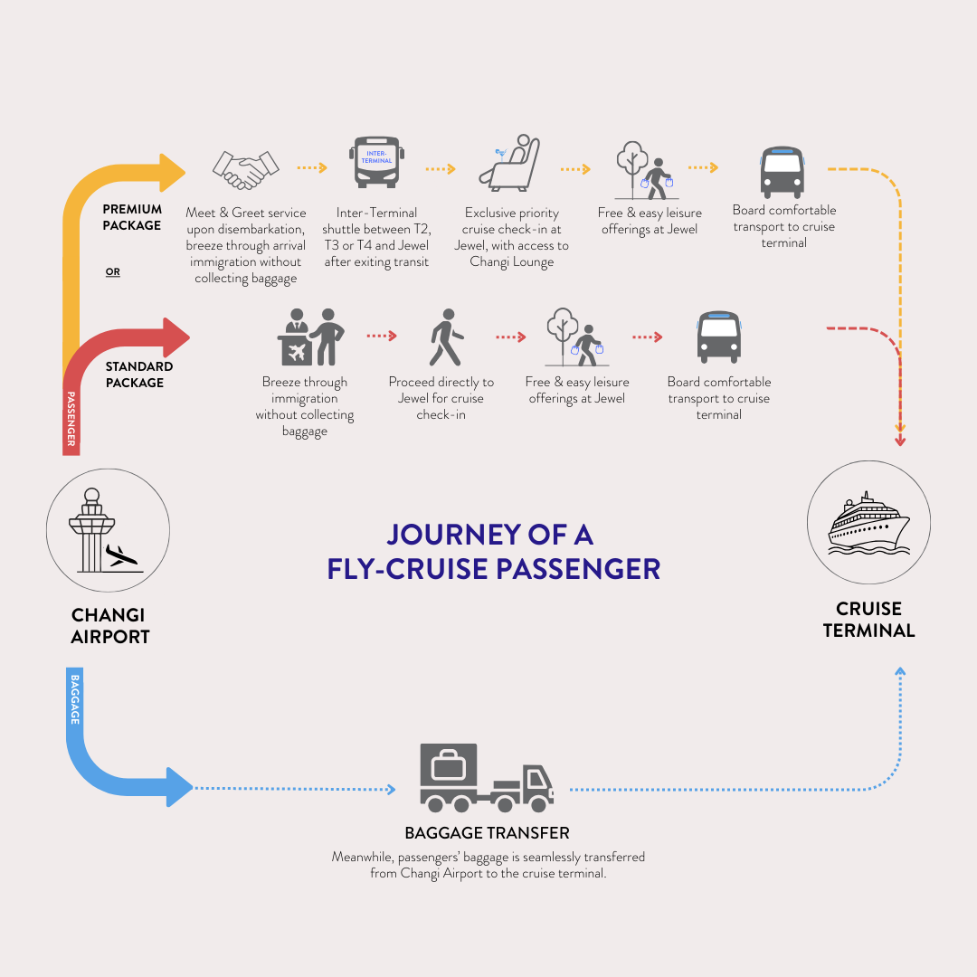 Fly-Cruise is a seamless transfer service that connects passengers arriving at Changi Airport directly to their respective cruise terminal.